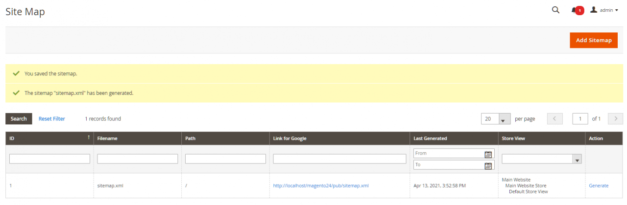 确定新站点地图的文件名和路径后,单击“Save & Generate”按钮以创建站点地图。生成后,该站点地图应出现在“Site Map”列表中,并带有指向您的站点地图的链接。